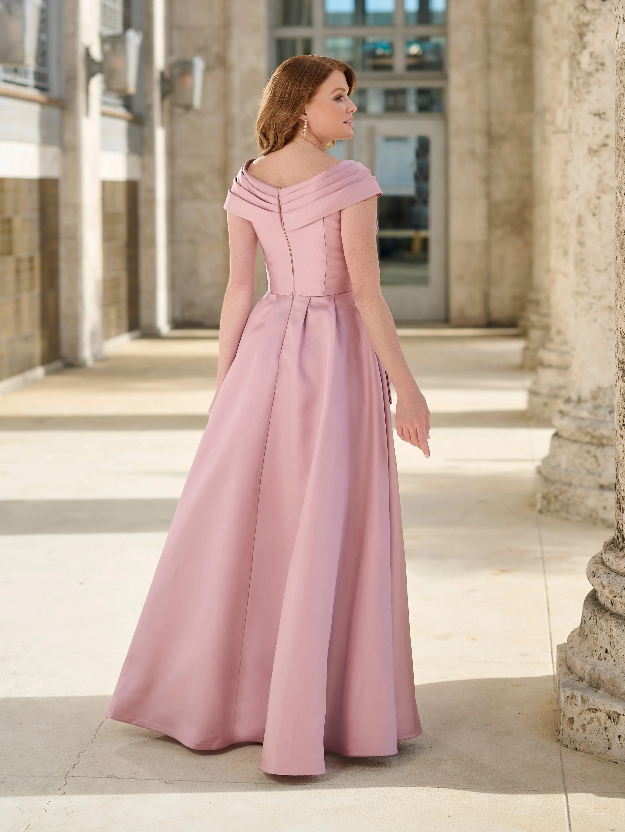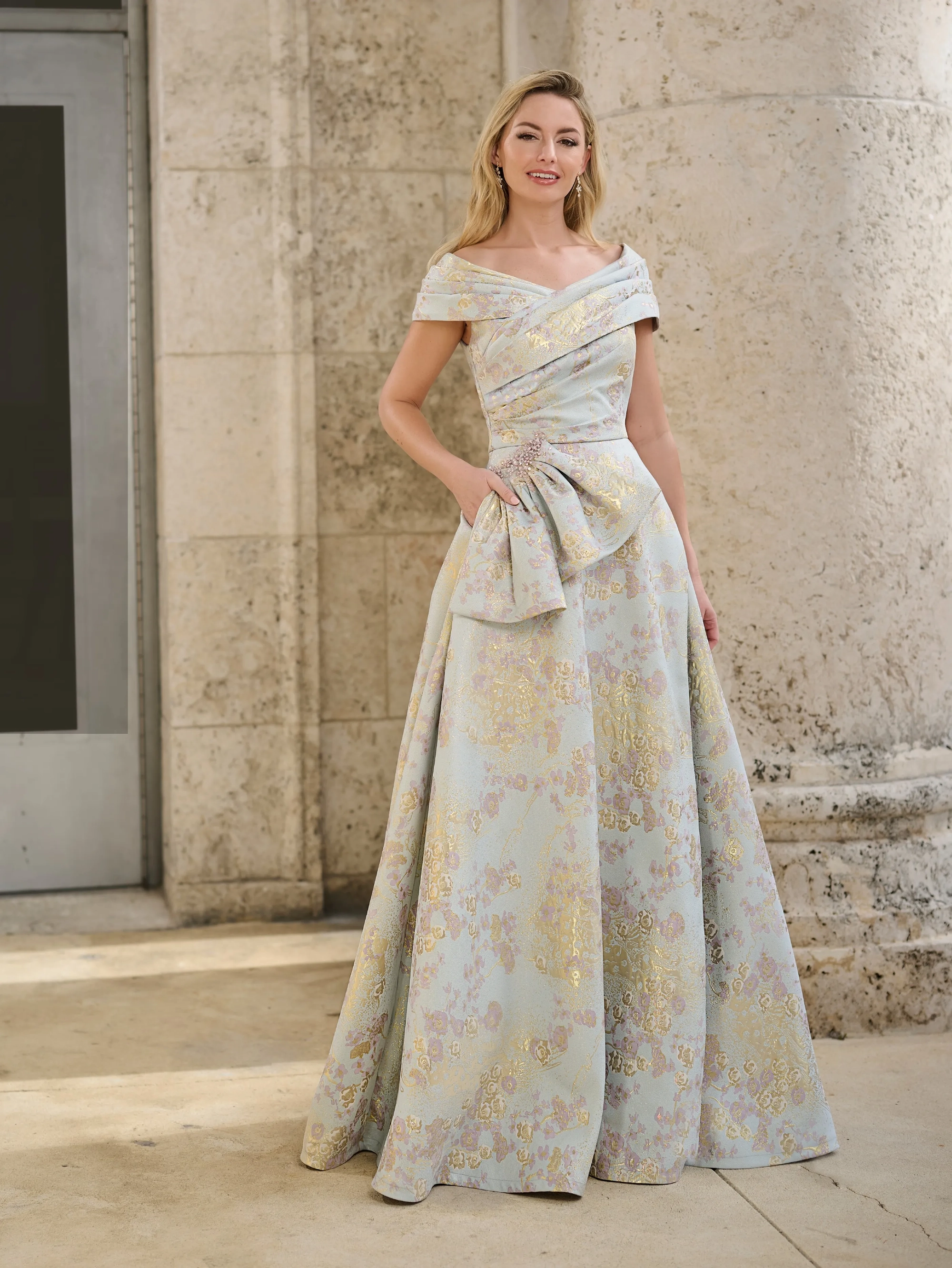 This style is available in Mikado and in brocade fabrics. Full A-line dress with off-shoulder collar draping and side bodice draping. Side skirt is decorated with detachable bow and beaded detail. Pockets on skirt side seams.